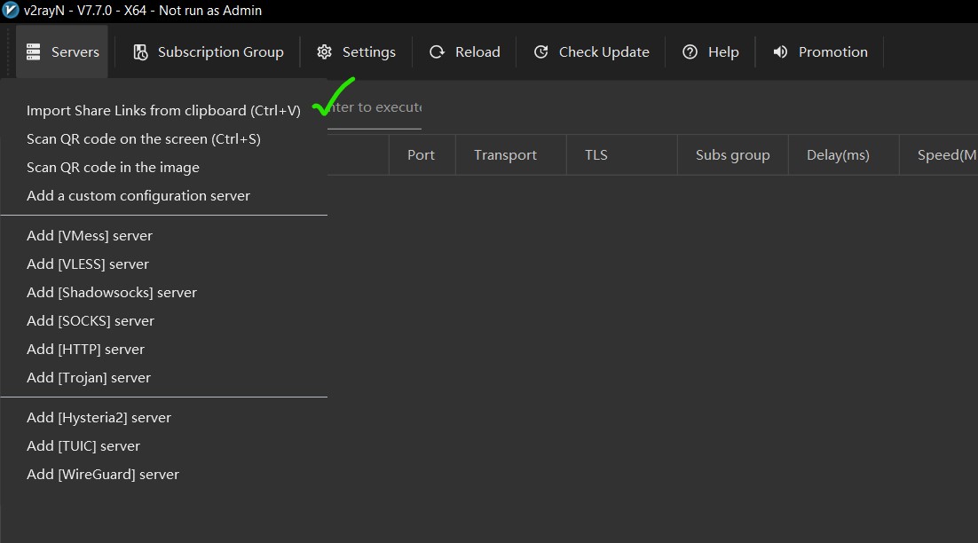 - در برنامه V2RayN، از منوی Server، گزینه Import bulk URL form clipboard را انتخاب کنید