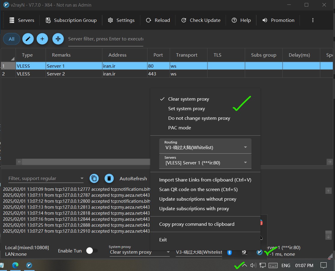 - پس از چند ثانیه، برنامه V2RayN باز شده و آیکون آن در نوار وظیفه و سیستم تری ویندوز ظاهر میشود